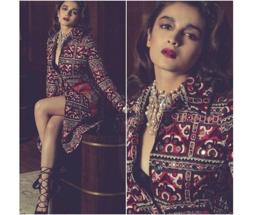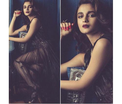 In this shoot Alia is wearing a Gucci dress with Ferragamo shoes.